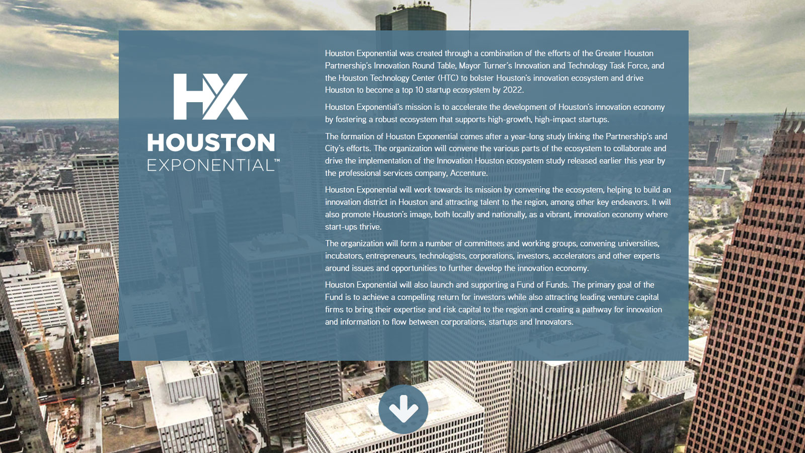 Houston Exponential was created through a combination of the efforts of the Greater Houston Partnership’s Innovation Round Table, Mayor Turner’s Innovation and Technology Task Force, and the Houston Technology Center to bolster Houston’s innovation ecosystem and drive Houston to become a top 10 startup ecosystem by 2022.